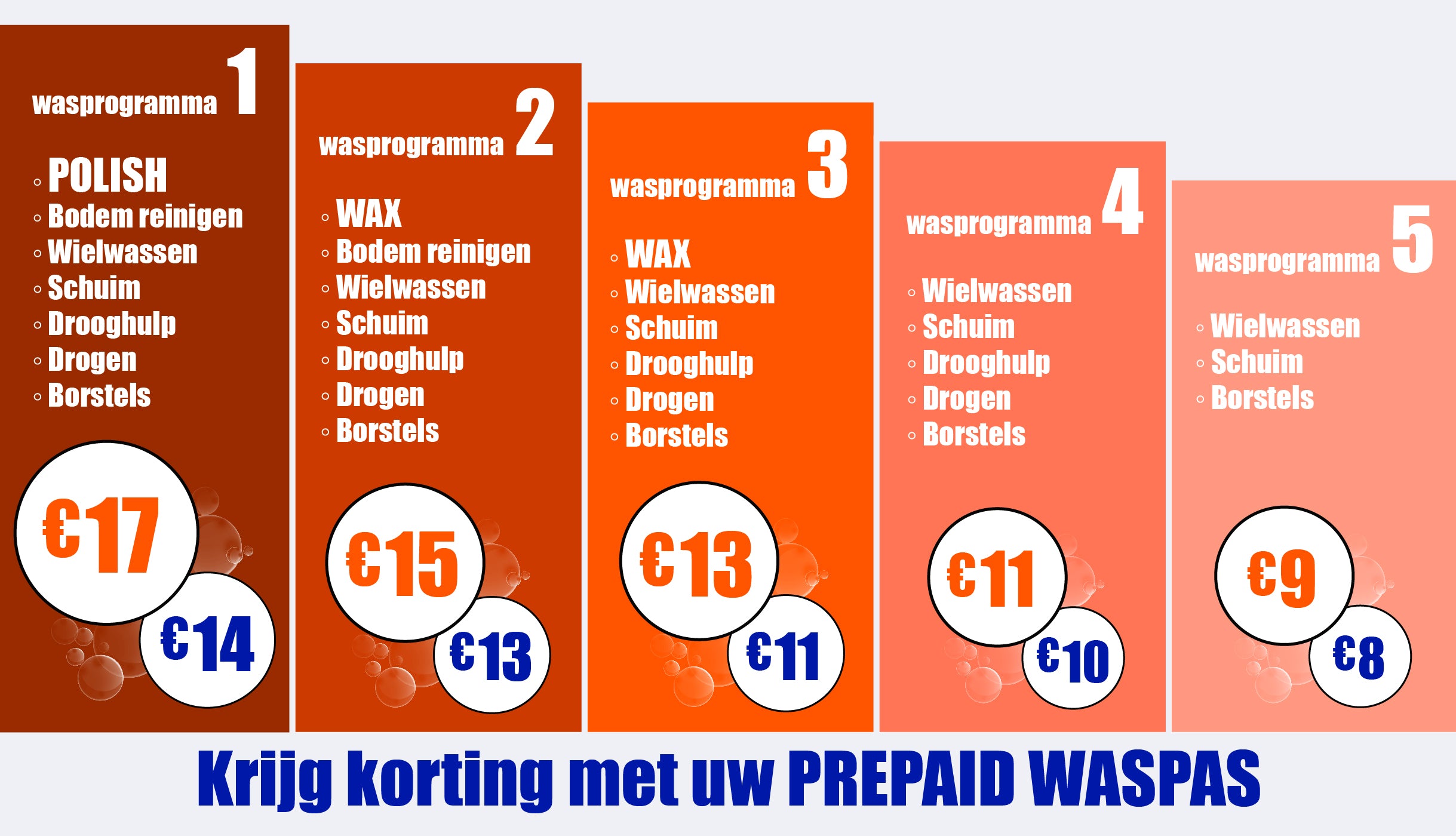 Krijg korting op al onze wasprogramma's met uw eigen pre-paid waskaart. Deze kunt u aanschaffen of opwaarderen via onze website of op locatie bij ons personeel.